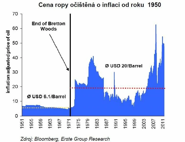 Zatímco průměrná cena ropy (očištěná o inflaci) byla v době platnosti dohody Breton Woods po 2. světové válce 6,1 USD za barel, po odklonu od zlata rapidně vzrostla. Od okamžiku, kdy byl americký dolar naposledy vázán na zlato, stál barel ropy průměrně 20,6 USD (očištěno o inflaci). Zatímco cena ropy měřená ve zlatě byla stabilní, ztratil dolar oproti ropě postupně více než 98 % své kupní síly.