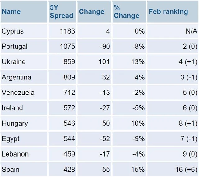 Podle březnové statistiky společnosti Markit jsou rizikové přirážky u CDS na státní dluhopisy nejvyšší v případě Kypru, Portugalska a Ukrajiny. V první desítce jsou i Španělsko nebo Maďarsko.