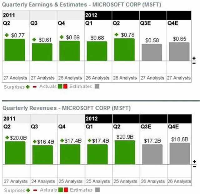 Valuace Microsoftu podle P/S (price-to-sales) jsou blízko Applu, obě firmy jsou podle tohoto ukazatele levnější než Google. Co se týče ohodnocení podle P/E (aktuálně 11,38), dá se čekat, že si Microsoft vzhledem k nižšímu tempu růstu zisku udrží atraktivní valuace oproti svým konkurentům.