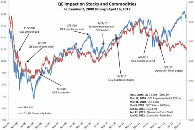 Nůžky mezi akciemi a komoditami se rozevřely. Co s tím provede případné QE3?