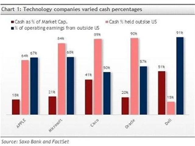 Na grafu je pět velkých technologických firem a jejich pokladní hotovost. Je zřejmé, že zůstatky většiny z těchto společností převyšují 20 % jejich tržní kapitalizace. Mezi nimi vyniká Dell s více než 50 %.
