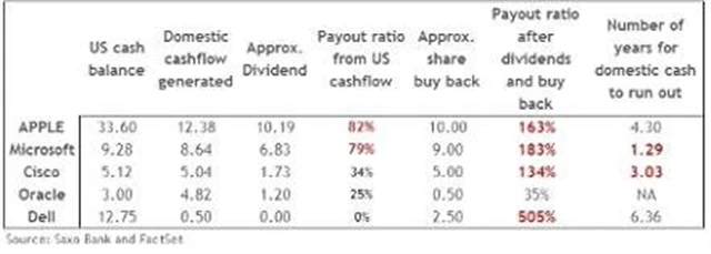 Většina z uvedených firem zklamala investory, protože jim vyplácí nízké částky. Proto je zajímavé sledovat, jak dlouho by byly tyto společnosti schopné vyplácet dividendy a zároveň vykupovat své akcie bez zásahu do zatím nezdaněných zásob zahraniční hotovosti.