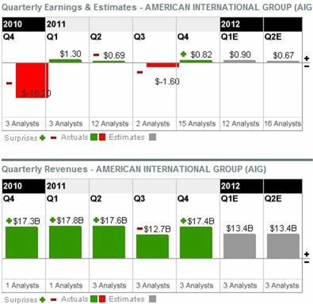 Pohled na fundamenty AIG je komplikovaný: tržby působí na první pohled velmi příznivě – tříletý průměr je +110 %. Tento ukazatel však není relevantní kvůli ohromným ztrátám z doby krize. Další valuační technika – porovnání pomocí P/E - naznačuje, že se společnost obchoduje na 3,8násobku zisku, což je daleko pod průměrem sektoru i nejbližších konkurentů.