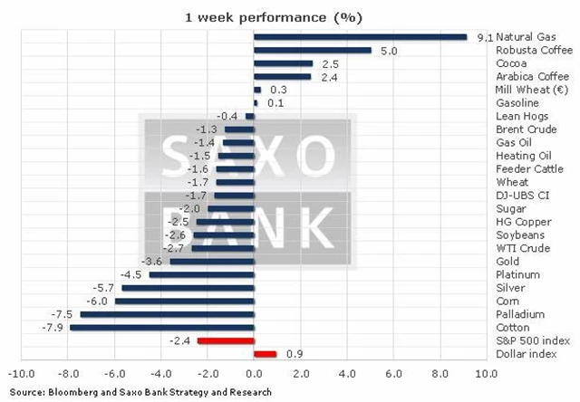 Většina komodit během uplynulého týdne ztrácela, jen zemní plyn prudce rostl díky důvěře, že se již vytvořilo minimum. Proto trpěl energetický sektor o něco méně. Vzácné kovy, zejména stříbro a paládium, byly již druhý týden pod náporem prodejců.