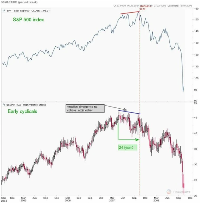 Ukáži nejprve předchozí vrchol růstového trhu z roku 2007. V tom roce vrcholil SMART index o 24 týdnů dříve než akciový index S&P 500.