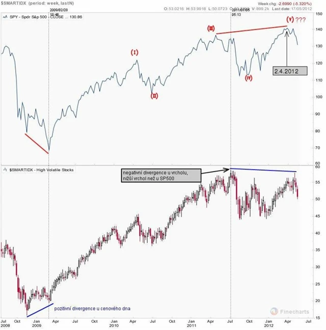Události posledních dnů mě donutily podívat se podrobněji na současný vývoj z dlouhodobějšího hlediska. Na Finecharts používám jeden akciový index, který nazývám SMART INDEX. Je složen z akcií, které velmi dobře signalizují významné cenové vrcholy a dna.