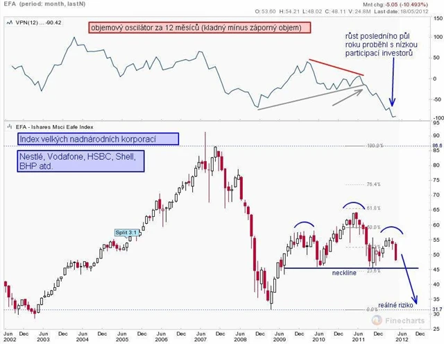 Obrázek: ETF pro mezinárodní rozvijející se trhy - EFA. Je složen z akcií významných svetových firem. Riziko jsem zakreslil prímo do grafu.
