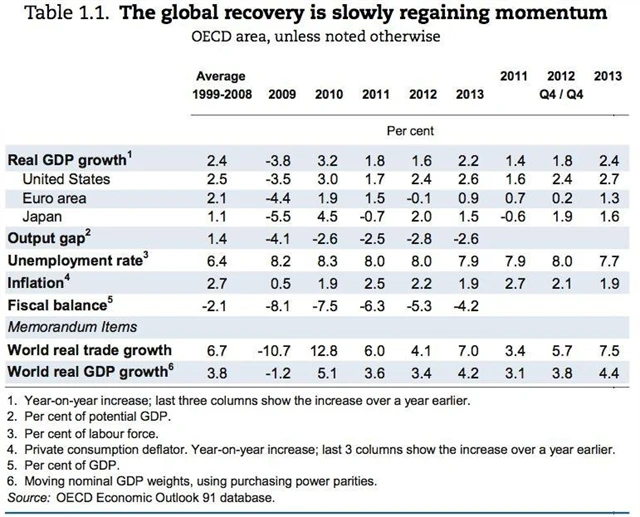 Světová ekonomika nabízí řadu otazníků: Zpomalí Čína postupně, nebo přistane bolestivě a tvrdě? Vydrží americké ekonomické oživení i v roce 2013? Rozpadne se eurozóna, nebo se podaří dluhovou krizi nějak vyřešit? OECD je ve výhledu "opatrně optimistická", řekl by jeden nejmenovaný americký centrální bankéř.