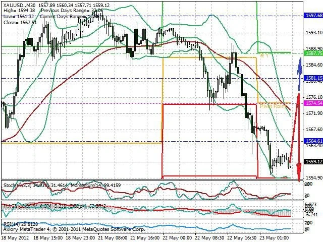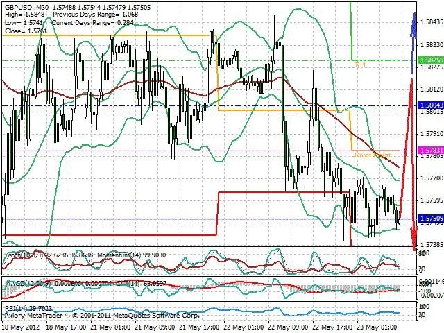 Předpokládaný pohyb pro dnešní den SHORT. Případné vstupy do obchodu z hladiny 1.582 s předpokládaným cílem 1.5735, případně až 1.5695. Proražení hladiny 1.582 může vést k pohybu s pravděpodobným cílem 1.5845 až 1.589.