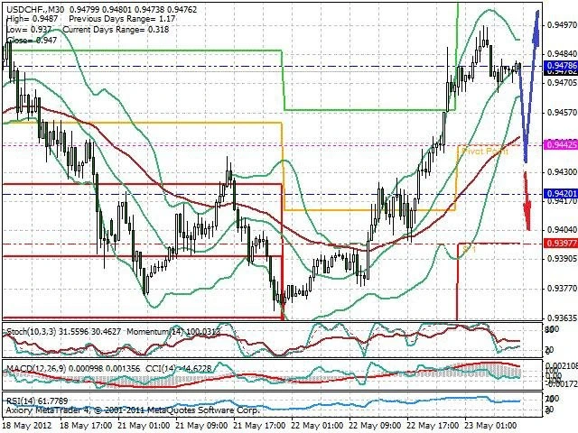 Předpokládaný pohyb pro dnešní den LONG. Případné vstupy do obchodu z hladiny 0.9435 s předpokládaným cílem 0.95, případně až 0.955. Proražení hladiny 0.9435 může vést k pohybu s pravděpodobným cílem 0.94 až 0.9365.