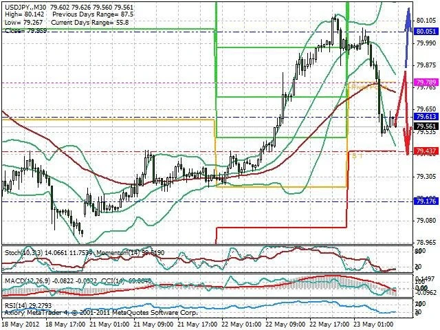 Předpokládaný pohyb pro dnešní den SHORT. Případné vstupy do obchodu z hladiny 79.85 s předpokládaným cílem 79.45, případně až 79.25. Proražení hladiny 79.85 může vést k pohybu s pravděpodobným cílem 80.15 až 80.35.