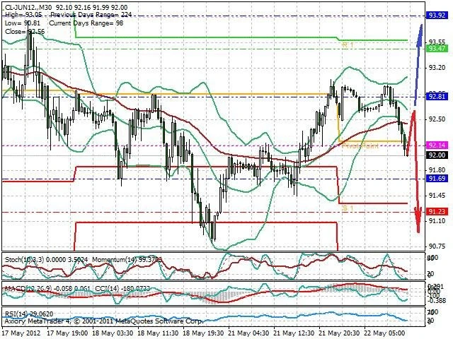 Předpokládaný pohyb pro dnešní den SHORT. Případné vstupy do obchodu z hladiny 92.65 s předpokládaným cílem 90.9 případně až 90. Proražení hladiny 92.65 může vést k pohybu s pravděpodobným cílem 93 až 93.75.