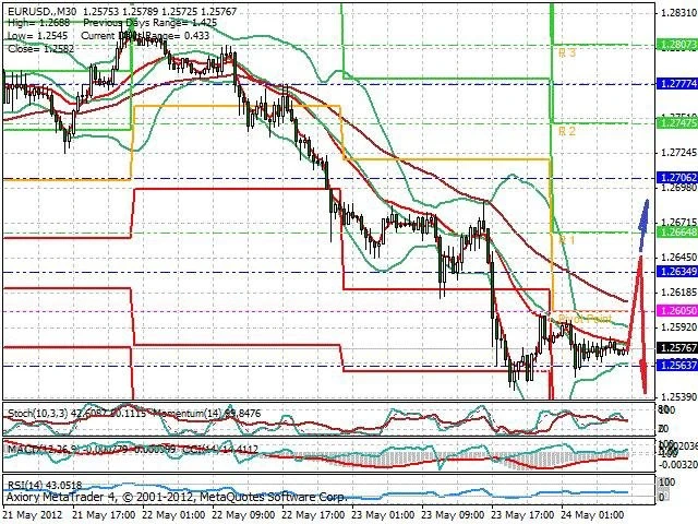 Předpokládaný pohyb pro dnešní den SHORT. Případné vstupy do obchodu z hladiny 1.2645 s předpokládaným cílem 1.2545 případně až 1.25. Proražení hladiny 1.2645 může vést k pohybu s pravděpodobným cílem 1.2685 až 1.2735.