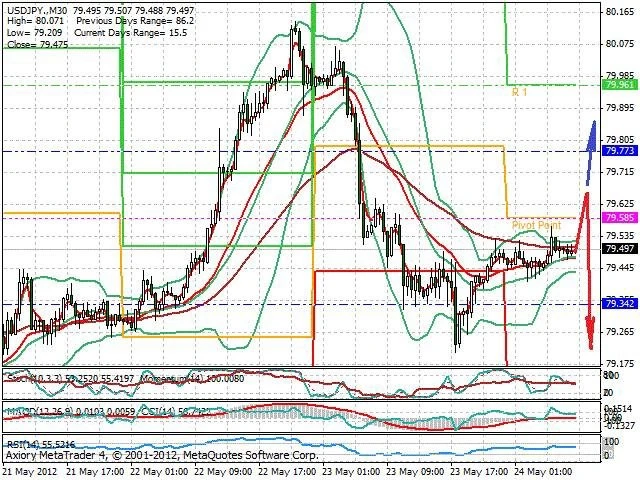 Předpokládaný pohyb pro dnešní den SHORT. Případné vstupy do obchodu z hladiny 79.65 s předpokládaným cílem 79.2, případně až 78.95. Proražení hladiny 79.65 může vést k pohybu s pravděpodobným cílem 79.85 až 80.15.