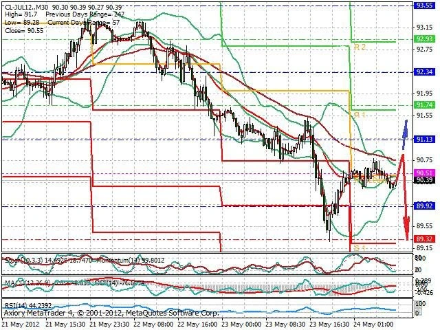 Předpokládaný pohyb pro dnešní den SHORT. Případné vstupy do obchodu z hladiny 90.8 s předpokládaným cílem 89.3 případně až 88.9. Proražení hladiny 90.8 může vést k pohybu s pravděpodobným cílem 91.4 až 91.75.