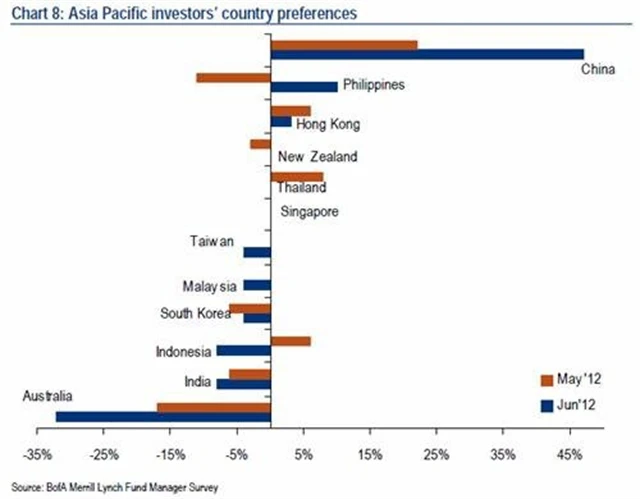 Čína je stále velice atraktivním investičním tématem. Zpomalení růstu její ekonomiky je patrné, ovšem snížení sazeb a snaha o stimulaci hospodářství naláká další peníze. I tak by bylo možné interpretovat výsledky průzkumu mezi manažery fondů ve východní Asii. Býčí názory na Čínu má výrazně více manažerů než v květnu. V nemilosti jsou naopak Indie a Austrálie. Především u druhé jmenované je to v souvislosti s "plusovým znaménkem" u Číny trochu překvapivé, protože australští exportéři mají právě v Číně jedno z hlavních odbytišť.