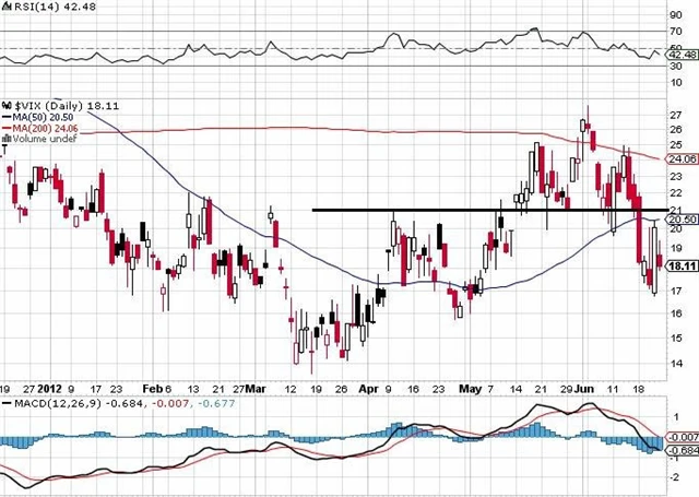 Index volatility VIX začal zkraje týdne vykazovat pozitivní změny. V pondělí se dostal pod hladinu 21, v následujících dvou dnech pokračoval ještě níže na hodnotu 17. Ve čtvrtek při výprodeji na akciích VIX ani intradenně nepřekonal hodnotu 21. To je pro akcie býčí signál. Ještě je nutné, aby zde zůstal a potvrdil návrat do předchozího dlouhodobého rozpětí 15 až 20.