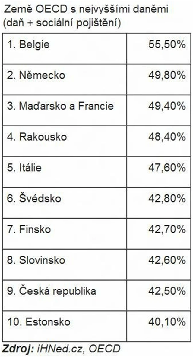 Stejnou cestou se navzdory předvolebním proklamacím vydala i česká vláda. Podle statistik Organizace pro hospodářskou spolupráci a rozvoj (OECD) měla v loňském roce ČR deváté nejvyšší daně z celé skupiny. Daně z příjmu a sociální pojištění tuzemským bezdětným zaměstnancům ukrojí 42,5 %. V případě zaměstnanců s dětmi je to vlivem odpočitatelných položek méně.