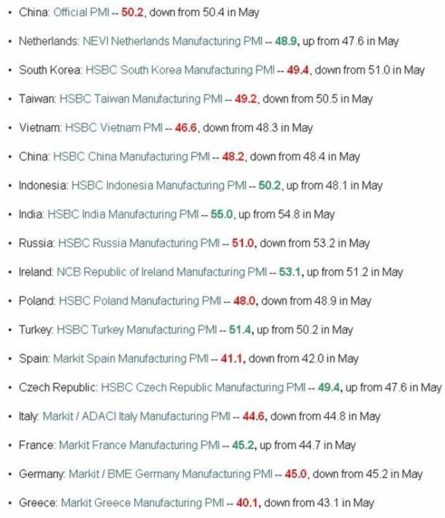 Indexy nákupních manažerů od Číny po USA - to je hlavní pondělní téma, co se výhledů světové ekonomiky týče. Oficiální čínský PMI se udržel nad 50, index od HSBC ovšem dále klesl a je těsně nad 48 body. Mírné zlepšení se v červnu dostavilo v Německu nebo za celou eurozónu, překvapili i čeští manažeři, ovšem Španělsko, Itálie, Řecko, nebo i Francie se dále potácejí hluboko pod 50bodovou hranicí. Evropská ekonomika nevzkvétá, chtělo by se připomenout.