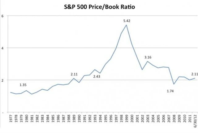 Cena akcií společností v indexu S&P 500 dělená jejich účetní hodnotou (P/B, price to book ratio) ukazuje, že spekulace dokáží překroutit realitu. V krátkém čase tento poměr vnáší světlo do toho, jak moc spekulace zkreslují tržní realitu.
