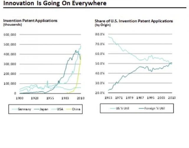 Na začátku ekonomického boomu v Číně v 80. letech inovace v zemi téměř neexistovaly. Dnes je situace jiná – v roce 2010 si Čína zaregistrovala 400 tisíc patentů, což ji postavilo na druhé místo za Spojené státy. Základ úspěchu amerického hospodářství – vyspělé technologie – je tak ohrožen.