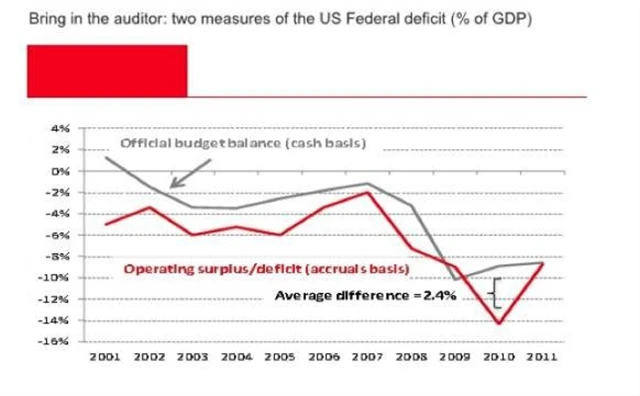 Vládní dluhopisy jsou při současných úrovních výnosu extrémním rizikem. Můžou za to samy vlády, které manipulují s vlastními čísly, aby zamaskovaly rozsah zadlužení. Následující tabulka ukazuje rozdíl mezi aktuálním americkým vládním deficitem a jeho součty.