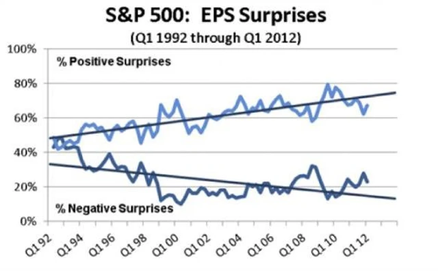 Hlavním ukazatelem je pro nás podíl společností z indexu S&P 500, které překvapí negativním ziskem na akcii. Graf ukazuje, že v posledních dvaceti letech roste podíl firem, které překvapí pozitivně. Můžou za to lidé, kteří mají na starosti vztahy s investory. Ti se naučili vydávat předběžné odhady tak, aby je společnosti dokázaly překonat. Nadbytek pozitivních informací totiž snižuje potřebu vysvětlovat detaily reportu. Naopak negativní překvapení společnosti komentují velice podrobně.