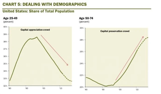První generace babyboomers ve Spojených státech – 78 milionů lidí, kteří vlastní většinu bohatství a stáli za posledních šest dekád za vším od politiky až po ekonomiku – dosáhla šedesátky. Už nevydělávají tolik jako v 80. a 90. letech. Stárnoucí populace lidí do padesátky má větší podíl na celkové populaci, ta ještě bude hodně hýbat s tokem kapitálu do nejrůznějších typů aktiv.