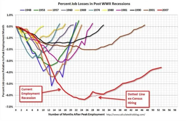 Tento ukazatel popisuje, jak moc je závažná současná situace na pracovním trhu – závažnější než jakákoli poválečná recese. Zlepšení je pomalé hlavně kvůli efektům hypotéční a finanční krize.