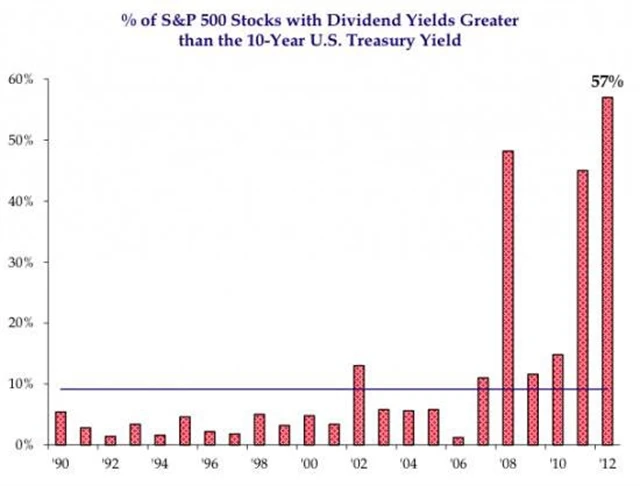 14. Podíl akcií v S&P 500, jejichž dividendový výnos je vyšší než výnos vládních dluhopisů