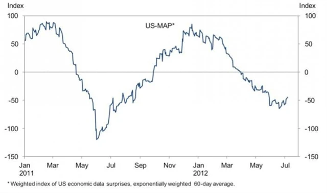 Jan Hatzius z Goldman Sachs poznamenává, že zatímco data zůstávají negativní, tempo negativních překvapení mírně klesá. To znamená, že data se v podstatě zlepšují, případně investoři už podmínkám přizpůsobili svá očekávání. Ať je to jakkoli, tento ukazatel nedávno na finančních trzích zaznamenal obrat.