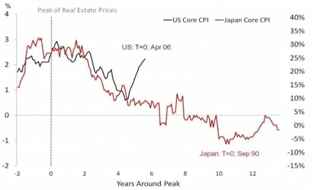 Inflace ve Spojených státech a Japonsku dosahovala stejných úrovní, když ceny na trhu nemovitostí dosáhly vrcholu v obou zemích. Graf ukazuje, že se americká inflace vydala jinou cestou, oživení v USA by tedy mohlo vypadat jinak než ztracená dekáda v Japonsku.