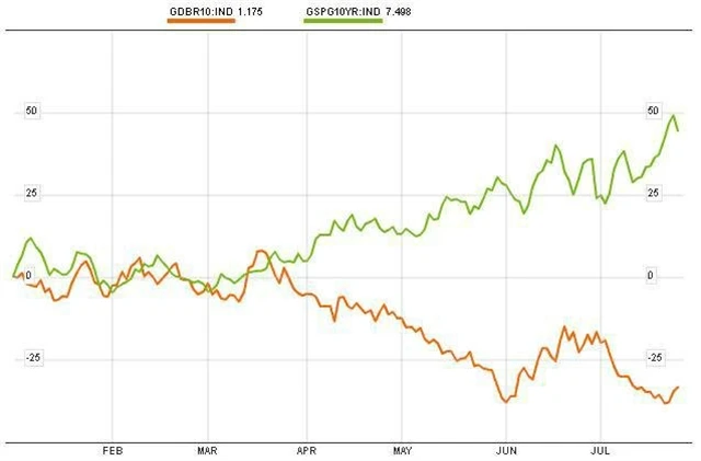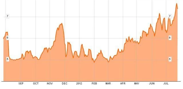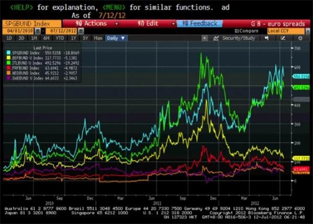 Dívám se na tento graf jako na měřítko paniky a klidu v Evropě. V poslední době jsou španělské výnosy na maximech, ty německé poblíž historických minim.
