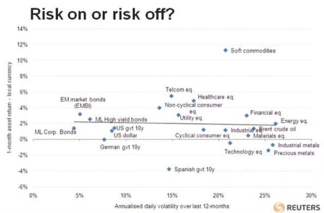 Tabulka ukazuje vývoj aktiv, a zároveň bere v úvahu, že některá z nich jsou volatilnější než jiná. Vertikální osa ukazuje návratnost za poslední měsíc, horizontální volatilitu za poslední rok. Během normálního měsíce by měla křivka uprostřed trochu růst – aktiva s vyšší volatilitou (tedy rizikem) by měla být výnosnější.