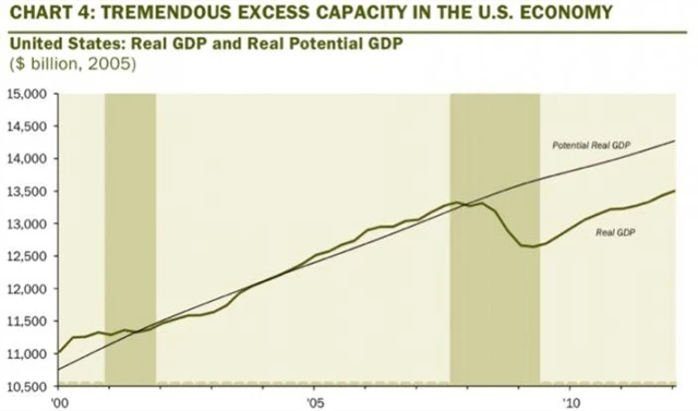 Rozdíl je 5,4 %. To je stejné, jako by celá Florida nic neprodukovala. Během třetího roku oživení přitom tento rozdíl bývá zcela setřen a americká centrální banka Fed se pouští do zvyšování základní úrokové sazby. Teď se hovoří spíše o třetím kole kvantitativního uvolňování.