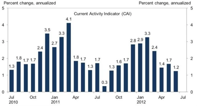 Jde o složení 25 týdenních a měsíčních amerických ekonomických ukazatelů. Poslední čísla ukazují, že domácí ekonomický růst zpomaluje.