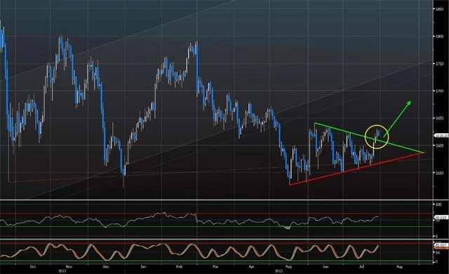 Zlato bylo schopno v polovině května 2012 udržet úroveň 1 550 USD za unci, což je minimum z prosince 2011. Právě od poloviny května 2012 až do minulého týdne cena zlata konsolidovala do strany a vytvořila konsolidační trojúhelník. Na grafu je znázorněn červenou rostoucí linkou a zelenou klesající linkou. Minulý týden cena zlata překonala zelenou klesající linku a prorazila konsolidační trojúhelník směrem nahoru (žluté kolečko). Z pohledu technické analýzy by tedy zlato mělo následující dny a týdny začít posilovat. Tomu nasvědčuje i nálada na trhu s akciemi těžařů zlata, která je na tříletém minimu.