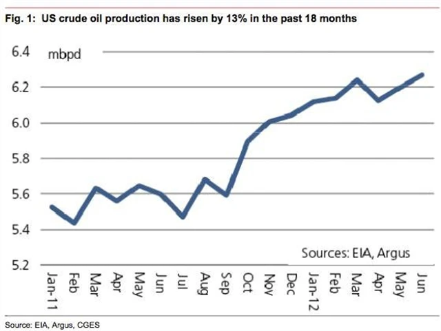 Produkce ropy ve Spojených státech rychle roste. Za poslední rok a půl se zvýšila o 13 %. Graf jsme vybrali z analýzy banky Nomura.