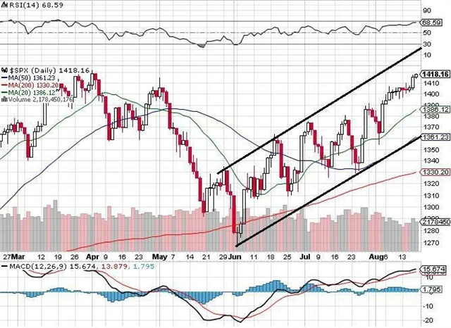 Závěr: Index S&P 500 je ve střednědobém horizontu v býčím nastavení. Všeobecně se očekává krátká a rychlá korekce, která bude vhodnou příležitostí k nákupu. Supporty leží na kulatém čísle 1 400, na 20denním klouzavém průměru (1 385) a na spodní linii kanálu v oblasti 1 360. Rezistence se nachází na hladině letošního maxima 1 422 a horní linii kanálu, tedy v zóně 1 420 až 1 430.