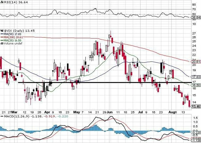 Index VIX se obchoduje na extrémně nízkých hodnotách a minulý týden ani jeden den neuzavřel nad 15. Tak nízko byl naposledy v roce 2007. Podporuje růst indexu S&P 500. Při nízkých hodnotách je přeprodaný a měl by se vrátit na 17, případně 20. Na indexu S&P 500 v té době dojde ke krátkodobé korekci.