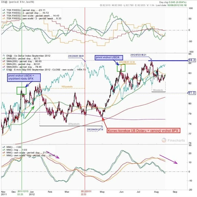 Rostoucí cena dolaru na světových trzích (mám na mysli futures kontrakt DX) působí na ceny akcií a komodit podobně jako rostoucí jen. Většina komodit je kótována v USD. Posilující dolar sráží ceny komodit dolů, což zprostředkovaně negativně ovlivňuje ceny akcií zejména v materiálovém a energetickém sektoru.