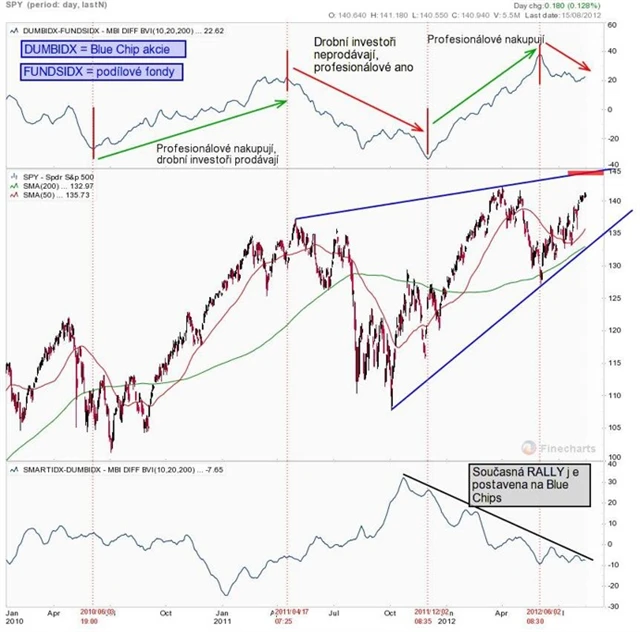 Graf navíc ukazuje, že nyní panuje averze vůči riziku. Blue Chip akcie stále ještě objemově překonávají rizikové cyklické akcie (v grafu označené jako SMARTIDX).