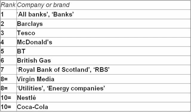 V desítce se dále objevuje řada světoznámých značek jako Nestlé nebo Coca-Cola - dobrá hospodářská čísla jsou jedna věc, nevybíravé obchodní praktiky a pracovní podmínky na rozvíjejících se trzích však médiím neuniknou. A z nich si tvoří obrázek běžný respondent podobného průzkumu. U Tesca nebo RBS jde spíše o národní témata, McDonald's leží Britům v žaludku v souvislosti se sponzorováním olympijských her v Londýně.