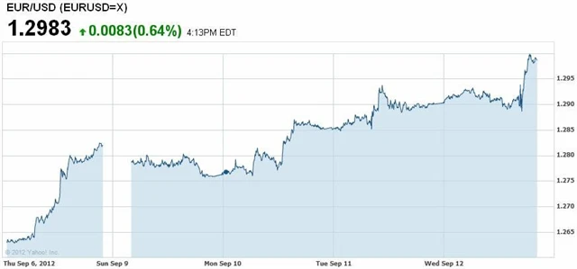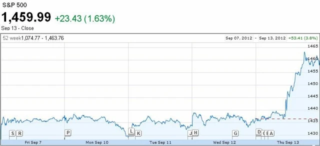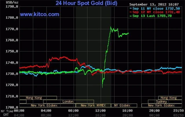 Fed ve čtvrtek oznámil již třetí kolo kvantitativnho uvolňování na podporu oživení americké ekonomiky. Bude každý měsíc nakupovat státem garantované hypotéční dluhopisy ve výši 40 miliard USD. Také ponechá nízké úrokové sazby až do poloviny roku 2015. Zlato na oznámení reagovalo růstem až k hranici 1 770 USD za trojskou unci, americké akcie posílily o zhruba 1,6 % (index S&P 500). Měnový pár EURUSD se dotkl hranice 1,3.