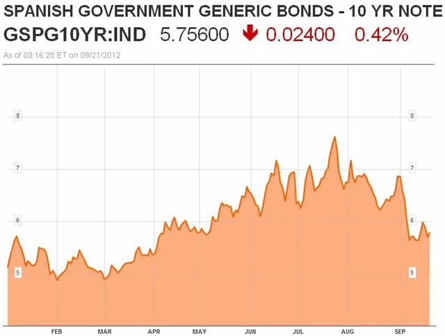 Ačkoli zprávy z ekonomiky eurozóny nejsou vůbec povzbudivé - což ukázal například index nákupních manažerů v eurozóně -, trhy zůstávají v dobrém rozmaru. Je to patrné z pohledu na výnosy španělských vládních dluhopisů. Zatímco ještě nedávno se investoři španělského dluhu štítili, nyní jej skupují ve velkém a ceny letí vzhůru a rizikové marže se rychle propadají.