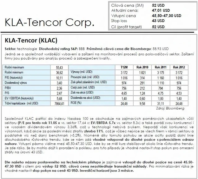 Společnost KLA-Tencor vyrábí vybavení a zařízení na monitorování procesů pro polovodičový sektor. Zařízení firmy jsou používána pro analýzu procesů a zabezpečení kvality. Firma je součástí indexu Nasdaq 100 a její akcie se obchodují na zajímavých poměrových ukazatelích vůči sektoru (P/E pro tento rok 11,05 vs. sektor 17,64; EV/EBITDA 5,7 vs. sektor 8,3). Poráží konkurenci také vysokým dividendovým výnosem 3,36 %, což u technologií nebývá zvykem.