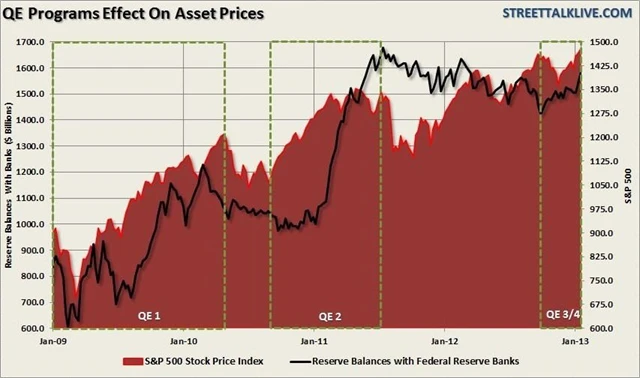 Velká část zmíněných argumentů zavání spíše nadějí než realitou. Opravdovým motorem současné akciové rally, důvodem, proč se peníze opravdu pohnuly směrem k akciím, je 85 miliard USD ze dvou zároveň probíhajících programů kvantitativního uvolňování ze strany amerického Fedu (QE3 a QE4).