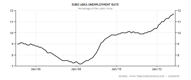 Nezaměstnanost v eurozóně v důsledku vývoje v periferních zemích silně vzrostla. Utlumený hospodářský růst způsobený dluhovou krizí je doprovázen rovněž výrazným růstem nezaměstnanosti na periferii EMU. Tomuto vývoji předcházel pokles míry nezaměstnanosti v Německu a ve Francii, což vykompenzovalo její následující růst v okrajových oblastech eurozóny. Nárůst míry nezaměstnanosti v Itálii a ve Španělsku v důsledku hospodářského propadu od počátku dluhové krize udržuje míru nezaměstnanosti v eurozóně na vysoké úrovni. Extrémně vysoká nezaměstnanost tlumí inflaci díky slabé poptávce a nízkým mzdovým požadavkům. Na základě svého očekávání ohledně nezaměstnanosti počítají analytici z Erste Group s mírou inflace +1,7 % pro rok 2013 a +1,3 % pro rok 2014. Tlak na inflaci směrem dolů by měl vyvolat další podporu ECB (snížení úrokové sazby na 0,5 %, alternativní opatření), což stlačuje výhled na vývoj úroků a výnosů.