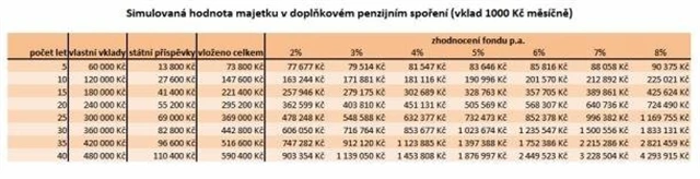 V celé analýze budeme pracovat s pravidelnou měsíční úložkou 1 000 Kč v předlhůtním spoření, bude tedy ukládána na začátku každého měsíce. V následující tabulce je vypočtena hodnota naspořeného majetku v doplňkovém penzijním spoření pro různá zhodnocení účastnických fondů.