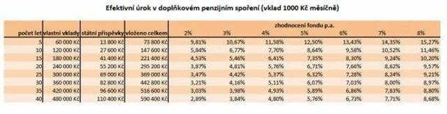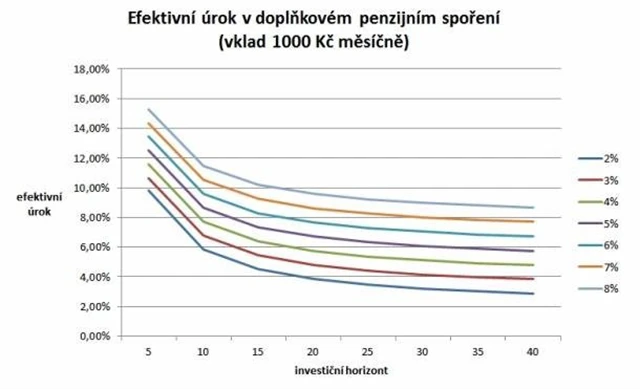 V tomto případě se velice důležitým ukazatelem stává takzvaný efektivní úrok. Ten říká, jaké je celkové zhodnocení vložených prostředků po započtení obou složek výnosu, tedy státního příspěvku a zhodnocení fondu. Výše zmíněný efektivní úrok bude pro různé úrovně zhodnocení fondu a investiční horizonty vypadat následovně: